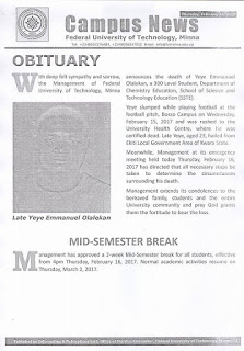 Following the death of a student of Federal University of Technology, Minna, which led to a riot and destruction of the school's clinic, the management of the school has imposed a compulsory two weeks break on all students. In a memo signed by the Ag. Academic Secretary, Dr. Shakirudeen .I. Yusuf, the students are to vacate the school premises by 16th February, 2016 and academic activities will resume on March 2, 2017.